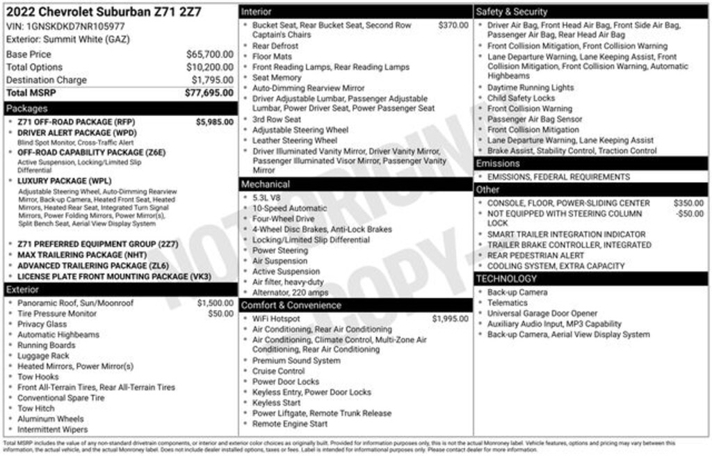 2022 Chevrolet Suburban Z71 EcoTec3 5.3L V8 10-Speed Automatic with Overdrive 4WD 4D Sport Utility Summit White Local Trade, 3 Month / 4,000 Mile Comprehensive Warranty, Ford Blue Advantage Certified, 10-Way Power Driver & Passenger Seat Adjusters, 1st & 2nd Row Color-Keyed Carpeted Floor Mats, 2-Speed Active Electronic AutoTrac Transfer Case, Advanced Trailering Package, Apple CarPlay/Android Auto, Auto-Dimming Inside Rear-View Mirror, Automatic Stop/Start, Automatic temperature control, Black Tubular Assist Steps, Bose 9-Speaker Stereo Audio System Feature, Bright Front & Rear Door Sill Plates, Color-Keyed Carpeting Floor Covering, Driver & Front Outboard Passenger Airbags, Driver Alert Package, Dual-Pane Power Panoramic Sunroof, Enhanced Driver Information Center, Floor Console w/Storage Area, Front & Rear Park Assist, Front dual zone A/C, Front High-Approach Angle Fascia, Hands-Free Rear Power Programmable Liftgate, Heated 2nd Row Outboard Seats, Heated Driver & Front Passenger Seats, Heated Steering Wheel, Hill Descent Control, Hitch Guidance w/Hitch View, Infotainment Display, Integrated Trailer Brake Controller, Lane Change Alert w/Side Blind Zone Alert, Leather-Wrapped Steering Wheel, LED Daytime Running Lamps, License Plate Front Mounting Package, Luxury Package, Max Trailering Package, Memory Settings, Memory Settings For Driver, Navigation System, Off-Road Capability Package, Outside Heated Power-Adjustable Mirrors, Power Liftgate, Power windows, Preferred Equipment Group 2Z7, Rear air conditioning, Rear Cross Traffic Alert, Rear Pedestrian Alert, Rear window defroster, Red Recovery Hooks, Remote keyless entry, Remote Start, SiriusXM Radio w/360L, Smart Trailer Integration Indicator, Speed control, Start/Stop System Disable Button, Universal Home Remote, Wheels: 20" x 9" Machined Aluminum, Wireless Charging, Z71 Off-Road Package.