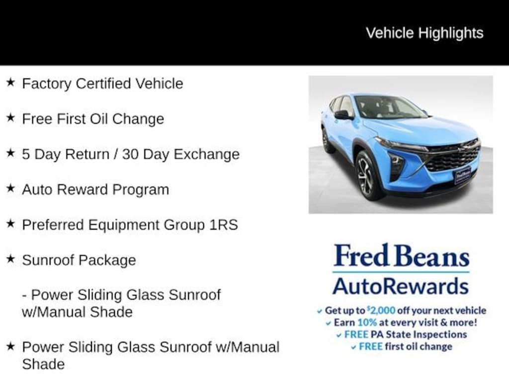 Discover the perfect blend of style, technology, and performance with the 2024 Chevrolet Trax 1RS. This compact SUV is designed to elevate your driving experience, offering a dynamic and efficient ride that will captivate your senses.Indulge in a host of premium features that elevate your ownership experience: Triton Certified Classic Vehicle 3 Month / 4,000 Mile Comprehensive Warranty Free First Oil Change 5 Day Return / 30 Day Exchange Auto Reward Program Power Sliding Glass Sunroof with Manual Shade Rear Park Assist Sport Steering WheelThe Trax 1RS also boasts the Driver Confidence Package, which includes Rear Cross Traffic Alert, Lane Change Alert with Side Blind Zone Alert, and Rear Park Assist, ensuring your peace of mind on the road.Slip behind the wheel and experience the power of the 1.2L Ecotec Turbo DOHC DI engine, delivering a responsive and efficient performance with an EPA-estimated 28 MPG in the city and 32 MPG on the highway. The 6-speed automatic transmission seamlessly translates this power to the front wheels, providing a smooth and engaging driving dynamic.This Trax 1RS is a Triton Certified Classic Vehicle, meaning it has undergone a rigorous inspection and reconditioning process to ensure it meets the highest standards of quality and reliability. With a comprehensive 3-month/4,000-mile warranty, you can drive with confidence, knowing your investment is protected.Elevate your daily commute and weekend adventures with the 2024 Chevrolet Trax 1RS. Discover the perfect blend of style, technology, and performance that will exceed your expectations. Schedule a test drive today and experience the difference for yourself.