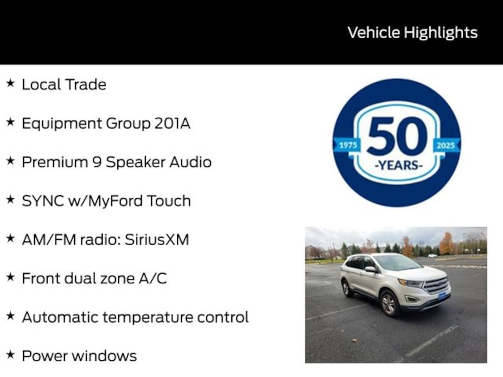 Recent Arrival! 2015 Ford Edge SEL 3.5L V6 Ti-VCT 6-Speed Automatic with Select-Shift AWD 4D Sport Utility White Platinum Metallic Tri-Coat Local Trade, AM/FM radio: SiriusXM, Automatic temperature control, Equipment Group 201A, Exterior Parking Camera Rear, Front dual zone A/C, Heated door mirrors, Leather-Trimmed Heated Bucket Seats, Power door mirrors, Power windows, Premium 9 Speaker Audio, Rear Parking Sensors, Rear window wiper, Remote keyless entry, Speed control, SYNC, SYNC w/MyFord Touch, Tilt steering wheel, Turn signal indicator mirrors, Wheels: 18" Aluminum Painted Sparkle Silver.