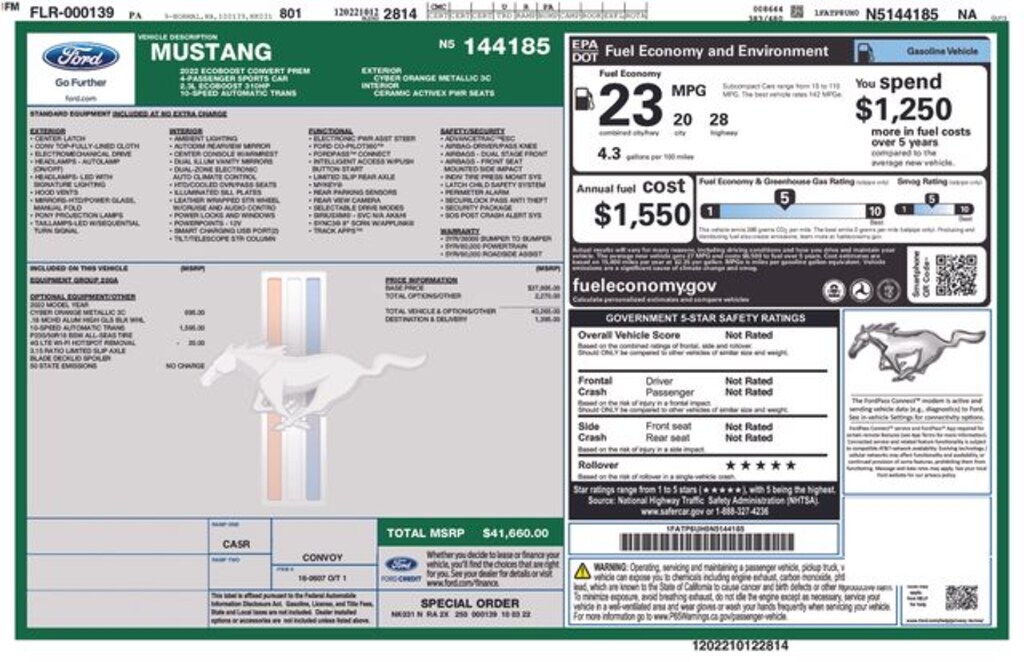 The Mustang's striking exterior is highlighted by the Cyber Orange Metallic Tricoat paint, which radiates confidence and style. Step inside the cabin, and you'll be greeted by a host of premium features, including leather-trimmed bucket seats, a SYNC 3 communications and entertainment system, and a power convertible roof that allows you to fully immerse yourself in the driving experience.