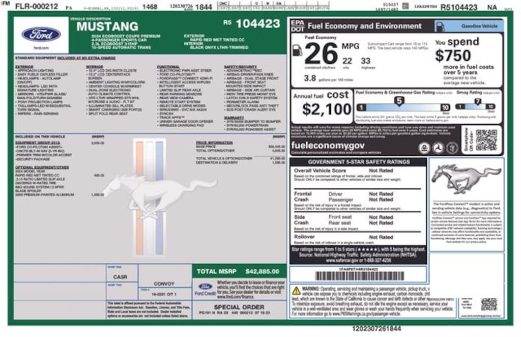 With its striking Rapid Red Metallic Tinted Clearcoat exterior, premium interior, and a wealth of advanced features, this 2024 Ford Mustang EcoBoost Premium is a true performance-oriented sports car that offers an unparalleled driving experience. Schedule a test drive today and discover the thrill of owning this exceptional vehicle.