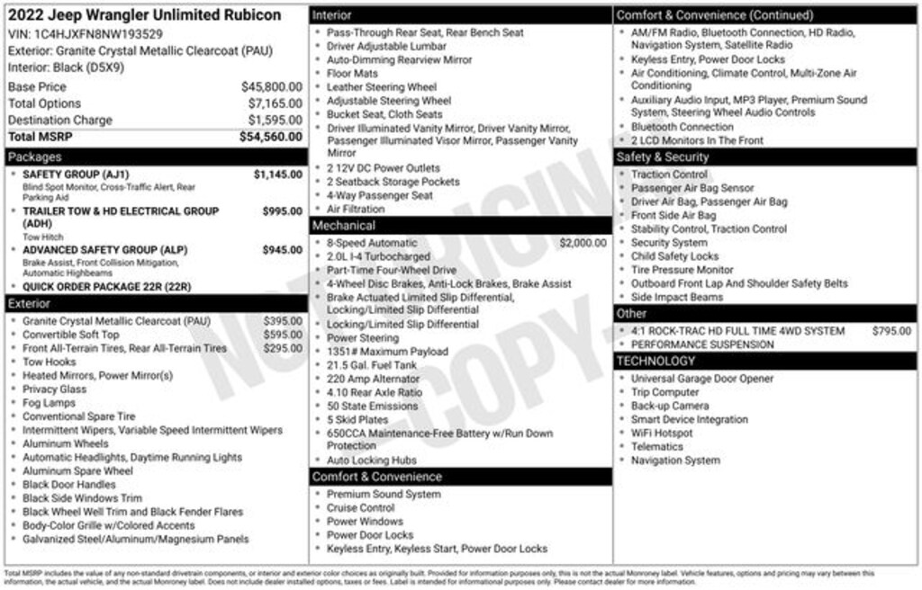 Discover the ultimate off-road companion with this 2022 Jeep Wrangler Unlimited Rubicon. Boasting a powerful 2.0L I4 DOHC engine paired with an 8-Speed Automatic transmission, this 4WD beast is ready to conquer any terrain. Adorned in a stunning Granite Crystal Metallic Clearcoat exterior, this Wrangler Unlimited Rubicon is equipped with a premium black sunrider soft top, providing the perfect blend of open-air adventure and all-weather protection.