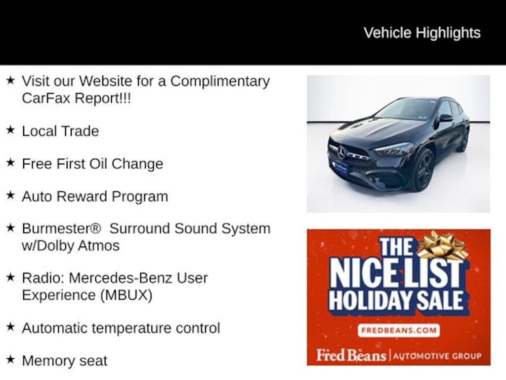 Boasting an impressive array of premium features, this GLA 250 4MATIC® is sure to impress. Enjoy the exceptional sound quality of the Burmester® Surround Sound System with Dolby Atmos, seamlessly connect your smartphone with Apple CarPlay® and Android Auto®, and stay comfortable with the automatic temperature control and memory seat. The power liftgate, exterior parking camera, and auto high-beam headlights add both convenience and safety to your driving experience.